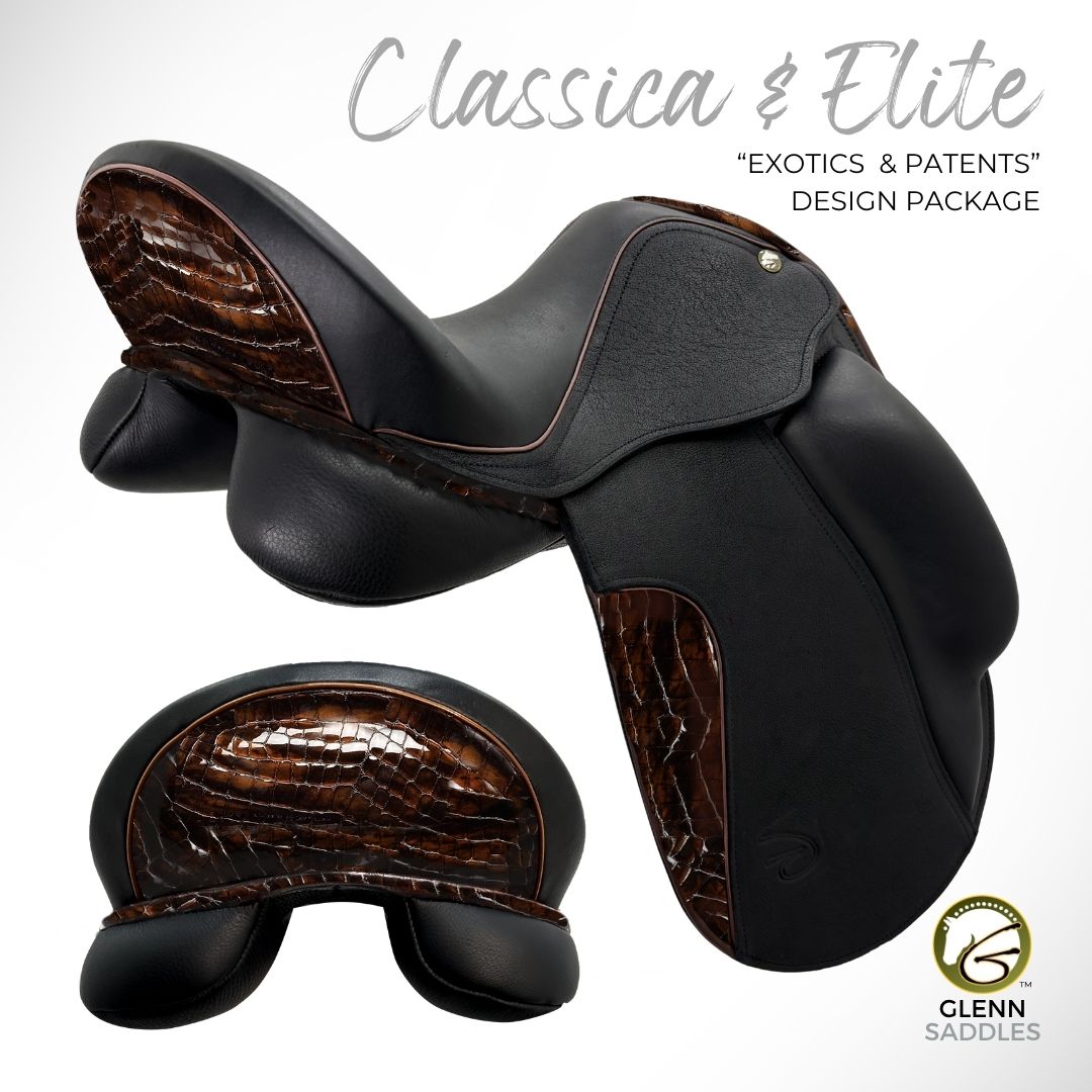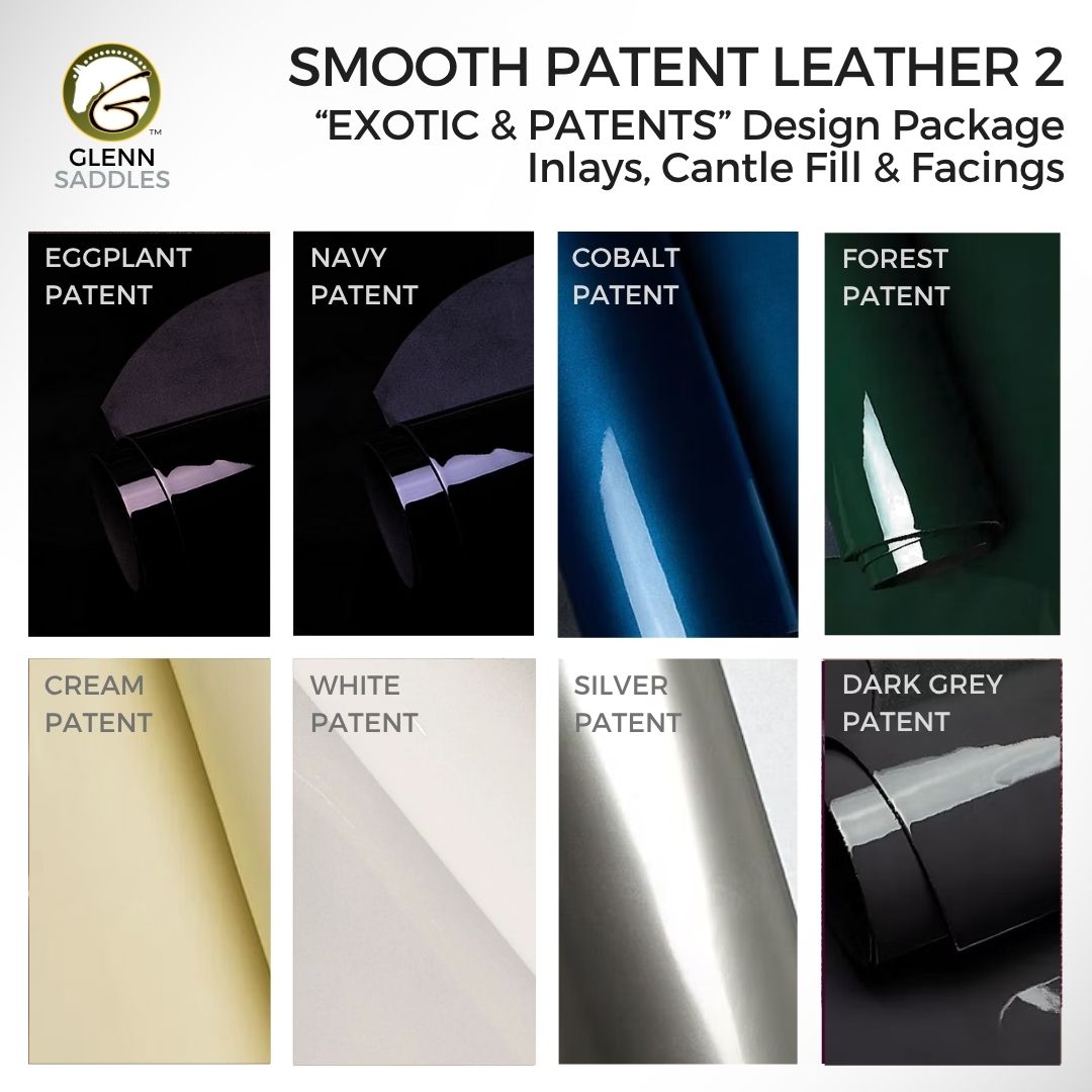 - “Exotics & Patents” – Tooled Moc Croc, Patent Moc Croc, or Smooth Patent leather inlays on flaps and rear of cantle, as well as front and rear facings; accent color welting around seat and cantle arch